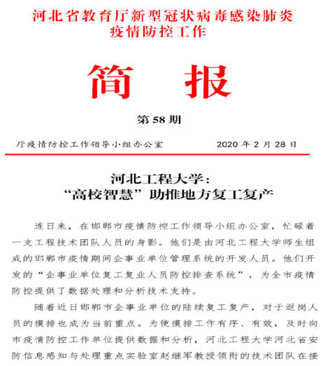 党支部支持邯郸市疫情防控,研发“云-端”协同的疫情防控数据管理和多维可视化系统,实现区域新冠疫情防控数据全流程多维度支持,获得河北省教育厅疫情防控简报等广泛关注,如图2所示。