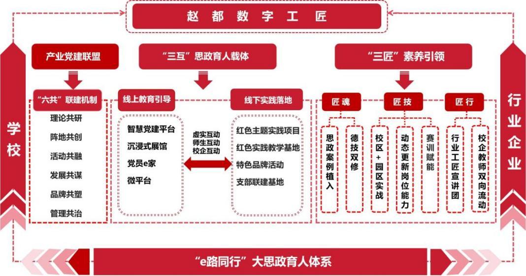 依托市域产教联合体和产业党建联盟,深化“榫卯嵌合、四方联动”协同育人机制,强化协同治理、资源整合、创新育人,坚持政府统筹、行业引领、企业主体、学校主导,推动专业建设与区域产业发展同频共振,形成以培养精技术、善应用为目标的产教融合育人体系。助力乡村振兴,实施对口技术帮扶,做到“科研服务写到大地上,服务群众融入人民心中”。精准对接地方发展需求,扩大党建“朋友圈”、画出“同心圆”,实现共建共享,打造“赵都工坊”数智人才培养金招牌。