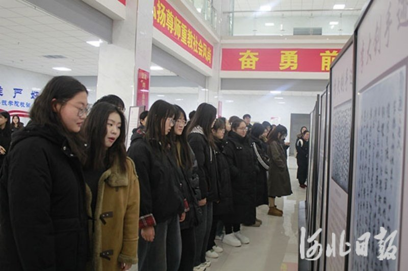 图为河北科技学院师生参观《李大钊诗歌手迹名言系列作品展》。