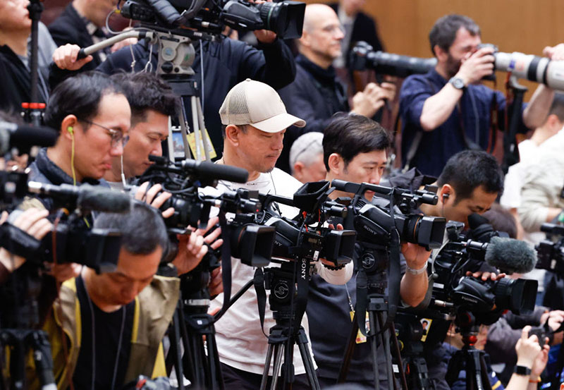 2025年3月10日,全国政协十四届三次会议在北京人民大会堂举行闭幕会。这是记者在会场采访。(新华社记者 张玉薇/摄)