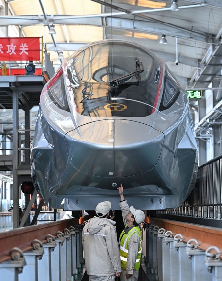 2025年2月25日,工作人员在铁科院国家铁道试验中心对CR450动车组样车进行试验验证。(新华社记者 李鑫/摄)