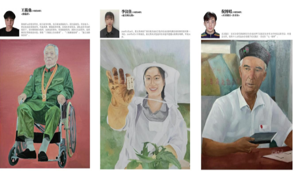 张桂梅、黄文秀等29名“七一勋章”获得者是民族的精英、人民的楷模,是共和国的功臣。为充分发掘这一重要红色资源,党支部牢牢把握住建党百年主题的主线,在前期充分了解功勋人物事迹的基础上,组织党员师生对功勋人物事迹进行研讨,以平凡党员视角去理解功勋人物精神世界,凝炼功勋人物为中华民族为美好生活不懈奋斗的精神,确定创作选材、布局、色调、元素等技法。“百年同心向党,星光闪耀课堂——七一勋章获得者事迹融入课堂”活动中,美术学、中国画、绘画、视觉传达设计、艺术设计学5个专业中分别遴选出《油画人物创作》《工笔人物创作》《插画语言实践》《广告设计》《二维构成》等五门重点课程,均以29名“七一勋章”获得者人物为原型,师生创作绘画和海报作品300余幅,通过画笔专业的手法表达对英雄的热爱。如学生在设计的勋章获得者著名作曲家吕其明的主题海报作品中,用战士的不同动作形象作为音符展示吕其明先生的乐谱,创新形式丰富生动,通过艺术创作过程进一步深化了教育主题。