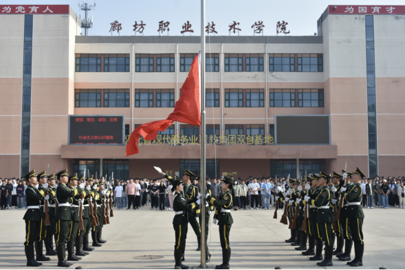 每周一清晨,廊坊职业技术学院举行升国旗仪式,开展国旗下5分钟主题教育