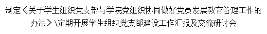 搭建好“桥梁纽带”,强化交流协作。建立学生组织党支部、指导部门和学院党委沟通协调机制,制定《关于学生组织党支部与学院党组织协同做好党员发展教育管理工作的办法》,共同做好学生“双重管理和协同配合”,对党员发展、教育、管理全过程进行详细规划。定期开展学生组织党支部建设工作汇报及交流研讨会,既督促党支部主要工作职责落实落细,又促进优秀经验做法互学互鉴。