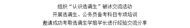 指向性谋划,多样性培养。组织“认识选调生”破冰交流活动,举办“学党史、悟思想”专题理论学习研讨培训,选派优秀大学生到河东区社会实践锻炼,开展选调生、公务员备考科目专项培训,邀请成功考取选调生学姐学长开展经验交流……目前已形成以理论学习研讨、社会实践锻炼、素质能力提升、工作实务历练等为主要内容,以理论与实践相结合、互助学习和指导学习相融合的模式,不断提高选调生综合素质。