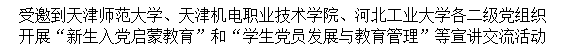 受邀到天津市高校和学校内二级学院党委开展“新生入党启蒙教育”和“学生党员发展与教育管理”等主题宣讲,开展“我为什么入党”大讨论,增强认识、端正入党动机,引领树立正确的世界观、人生观和价值观,把学习的具体目标同民族复兴的宏大目标结合起来。